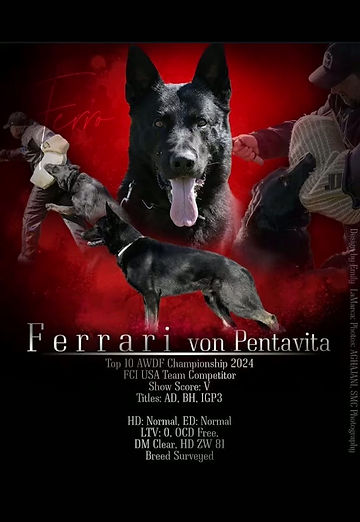 Ferrari has hard strong teeth, correct bite, correct amount of teeth. Strong bones and a large head. He will improve front assembly, feet, and rear angulation. He has a big motor and strong drives over all, clear aggression, genetically hard grips, insane food drive, great tracking, excellent work ethic, and learns new tasks within one or two sessions. He is territorial inside of his territory/car/kennel, and socially open outside. Ferrari is breed surveyed black (recessive).